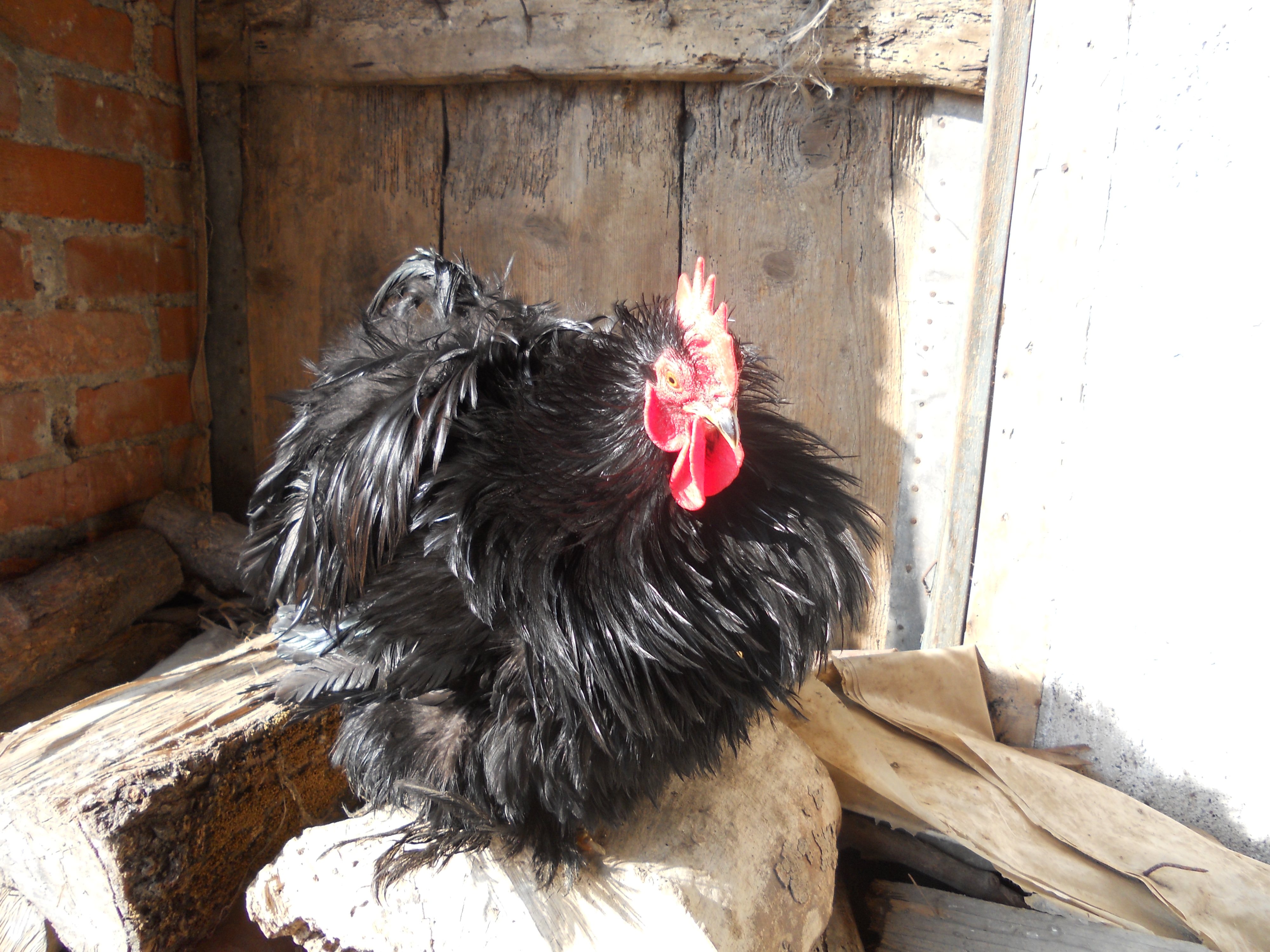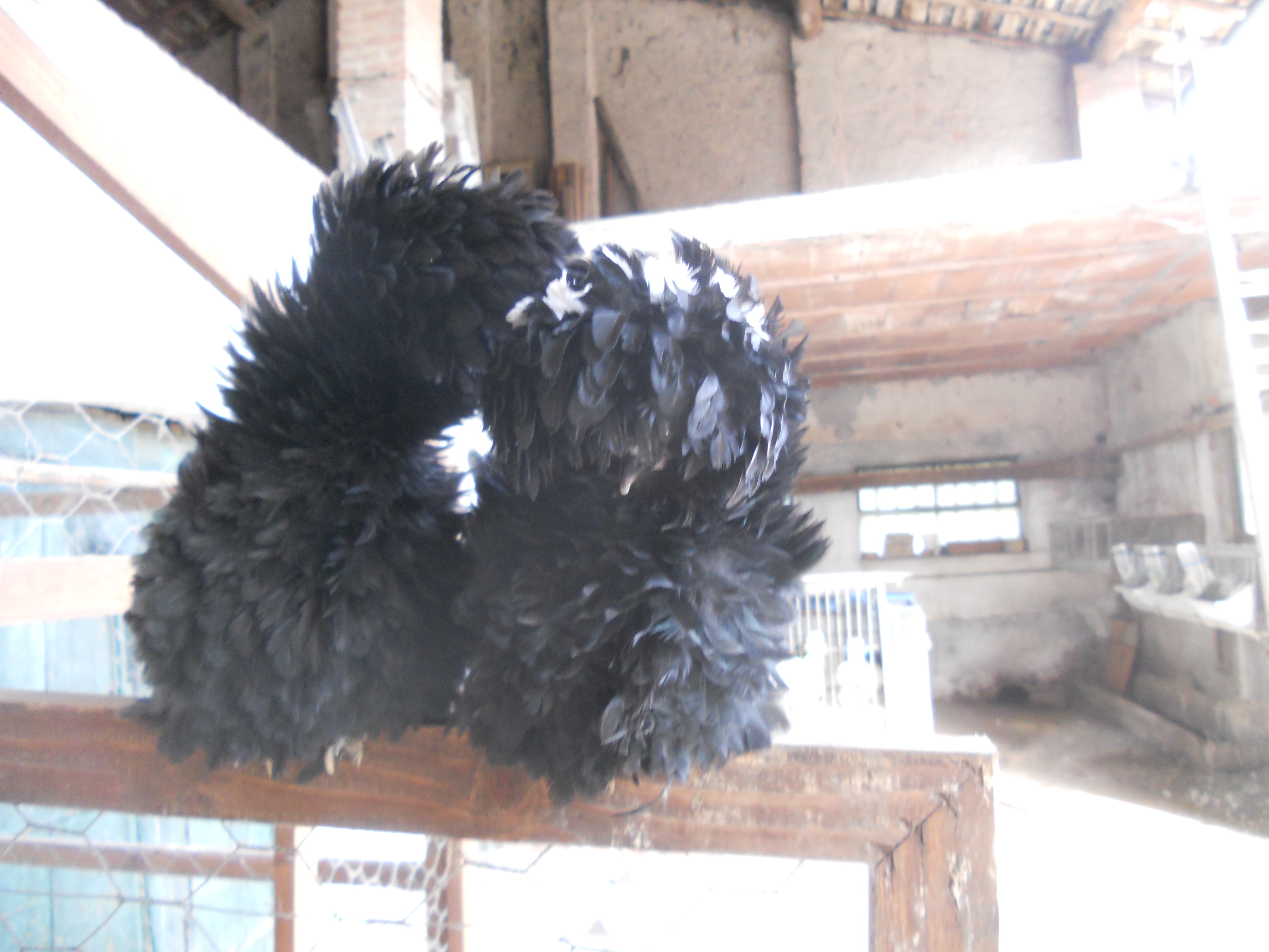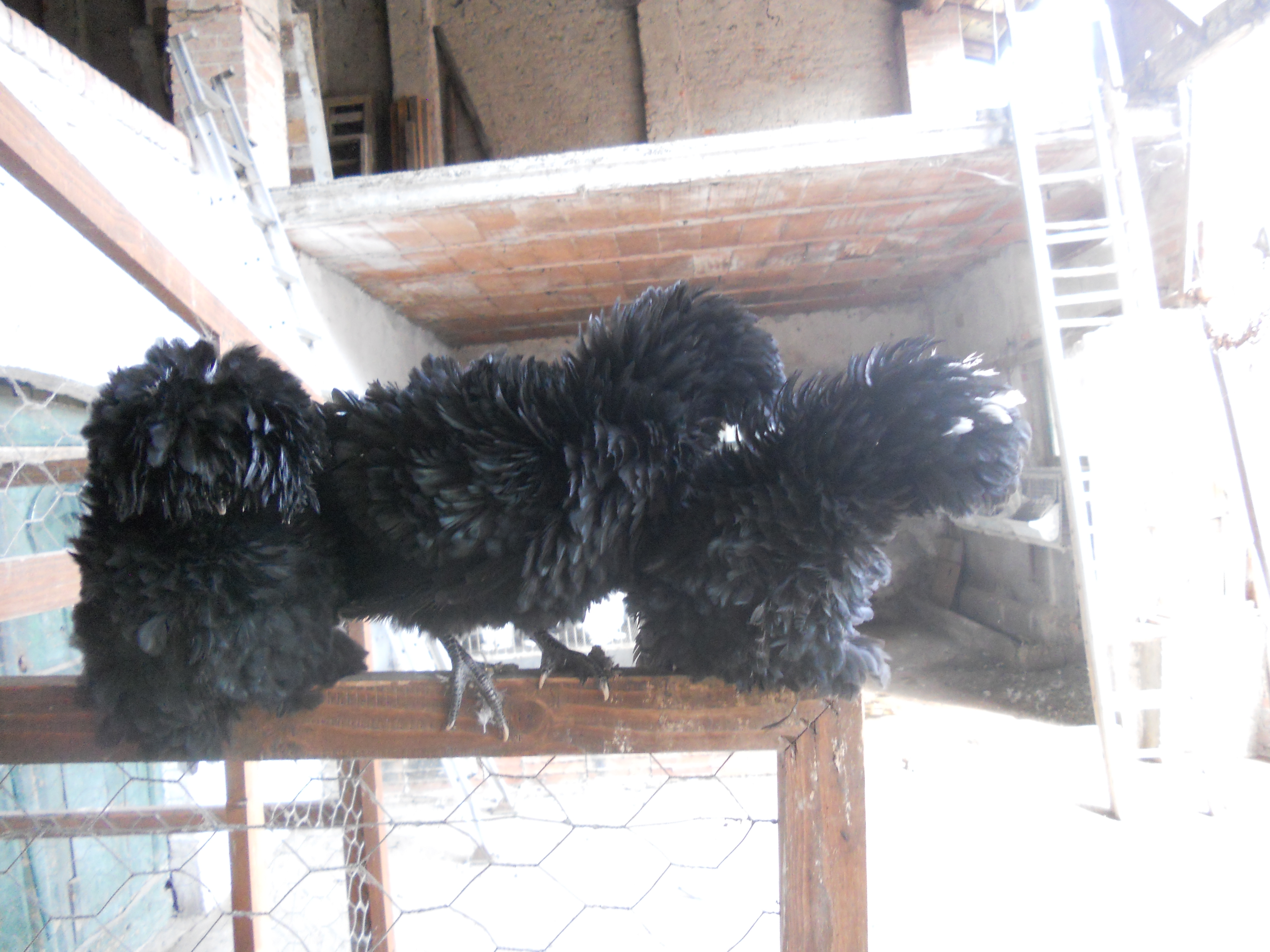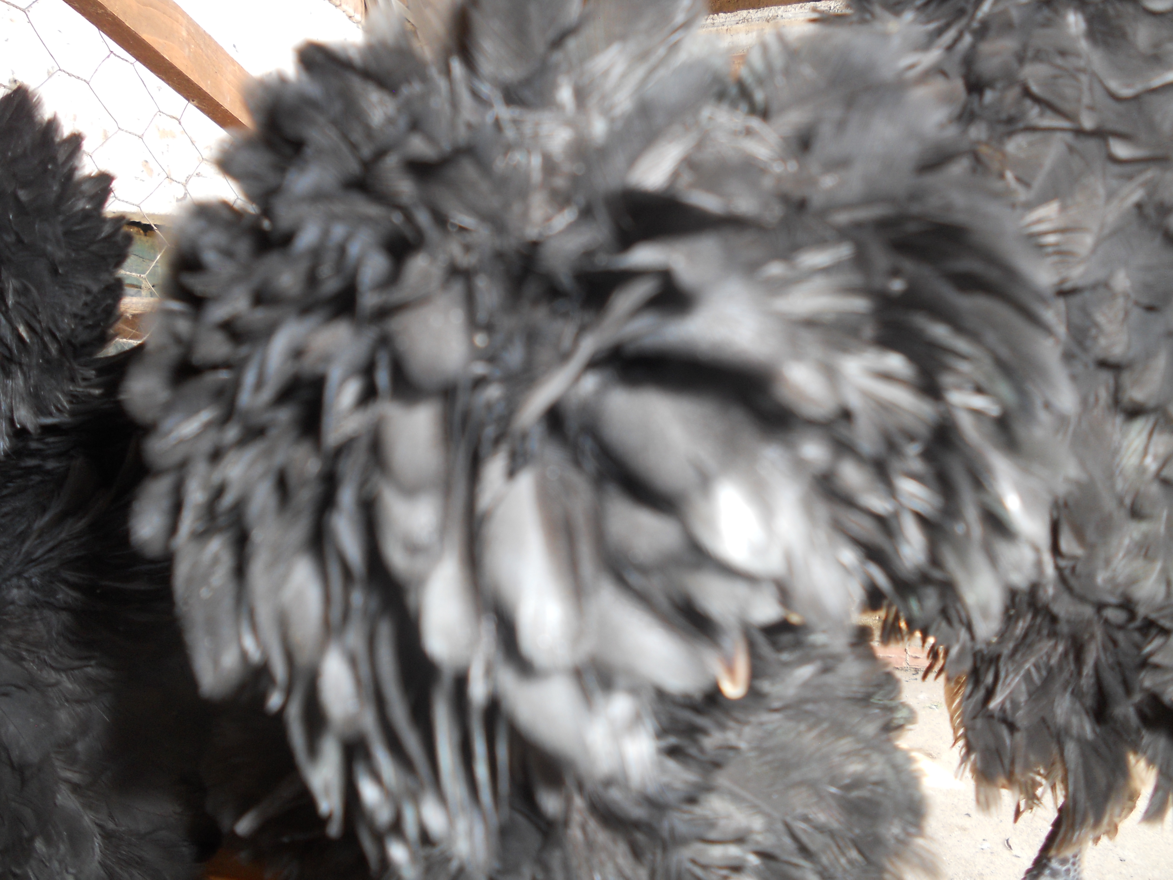 Ho comprato a una mostra avicola questa coppia di cocincini neri arricciati,sono molto simpatici e aggraziati anche se si sporcano facilmente a causa del ricchissimo piumaggio.A destra un gallo pollish riccio.