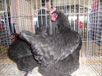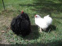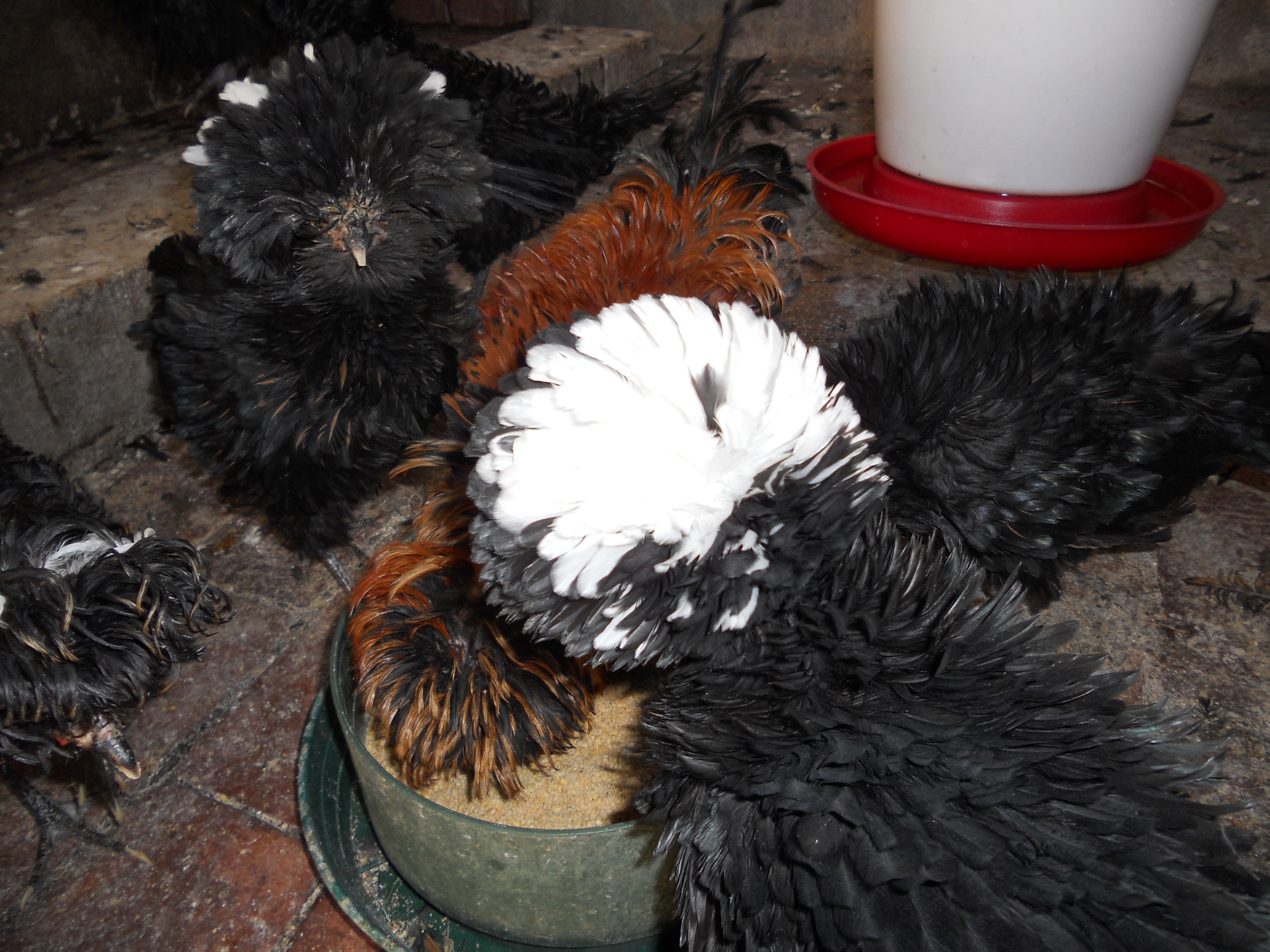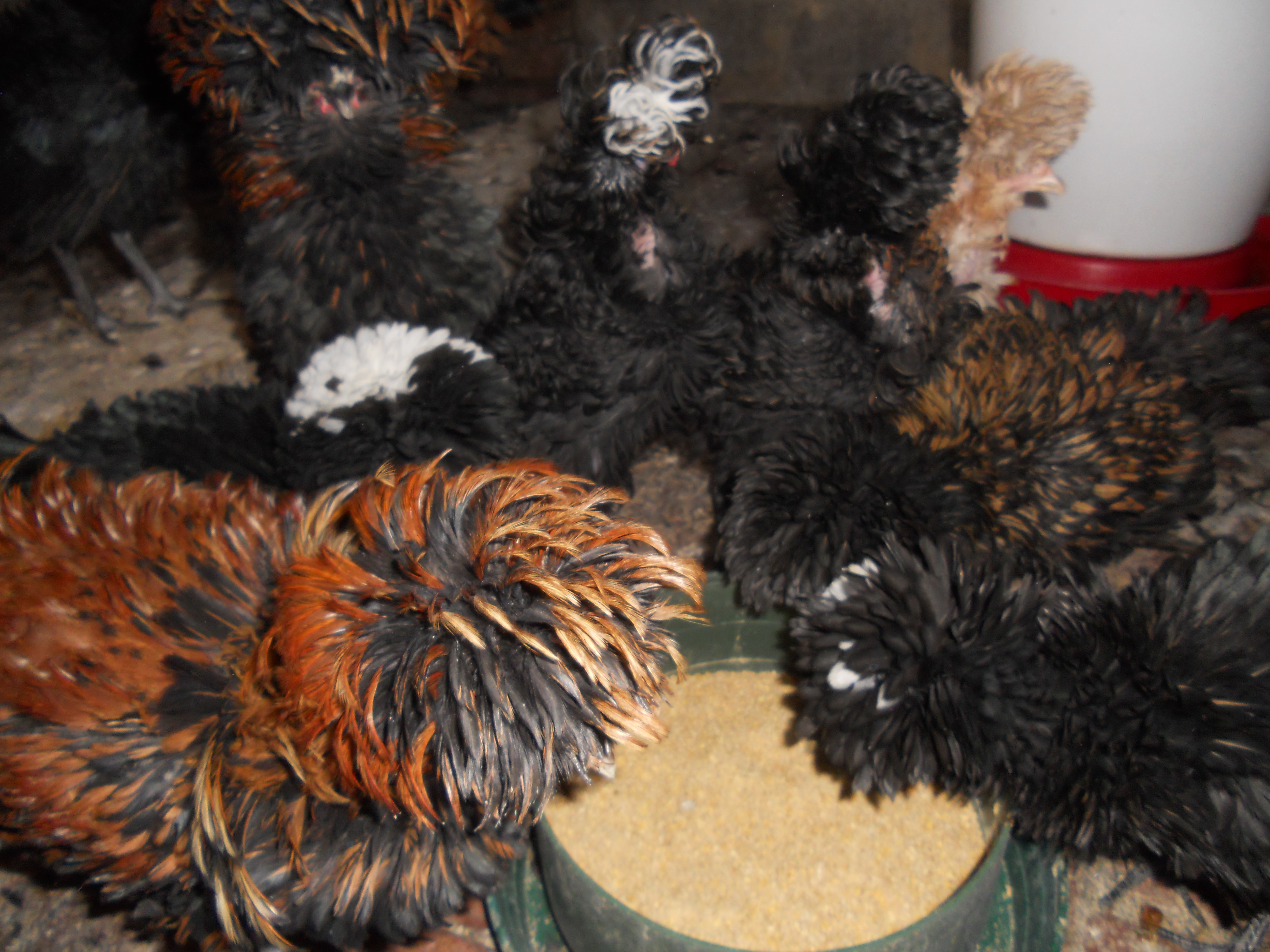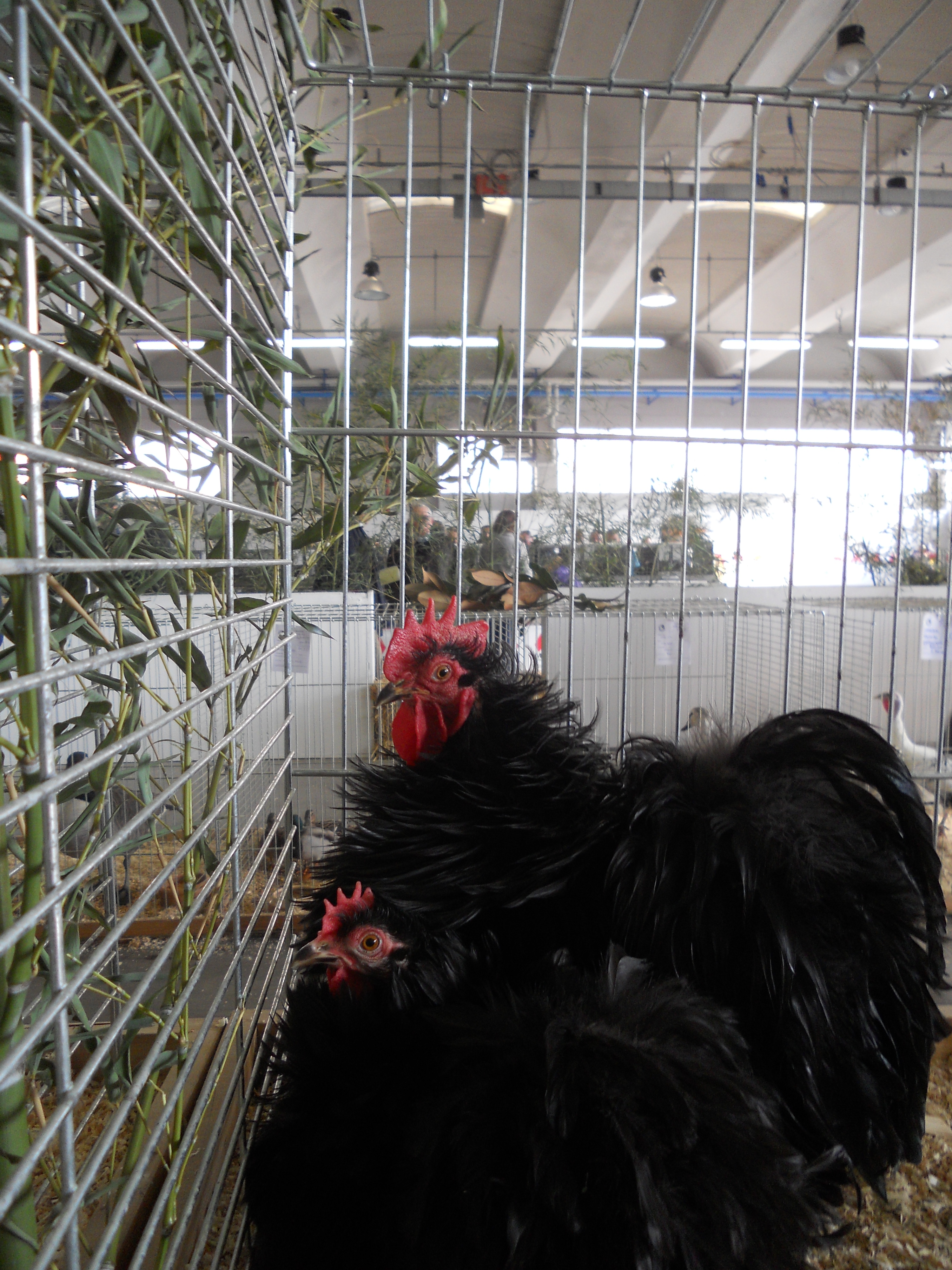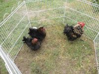 Ho comprato a una mostra avicola questa coppia di cocincini neri arricciati,sono molto simpatici e aggraziati anche se si sporcano facilmente a causa del ricchissimo piumaggio.A destra un gallo pollish riccio.