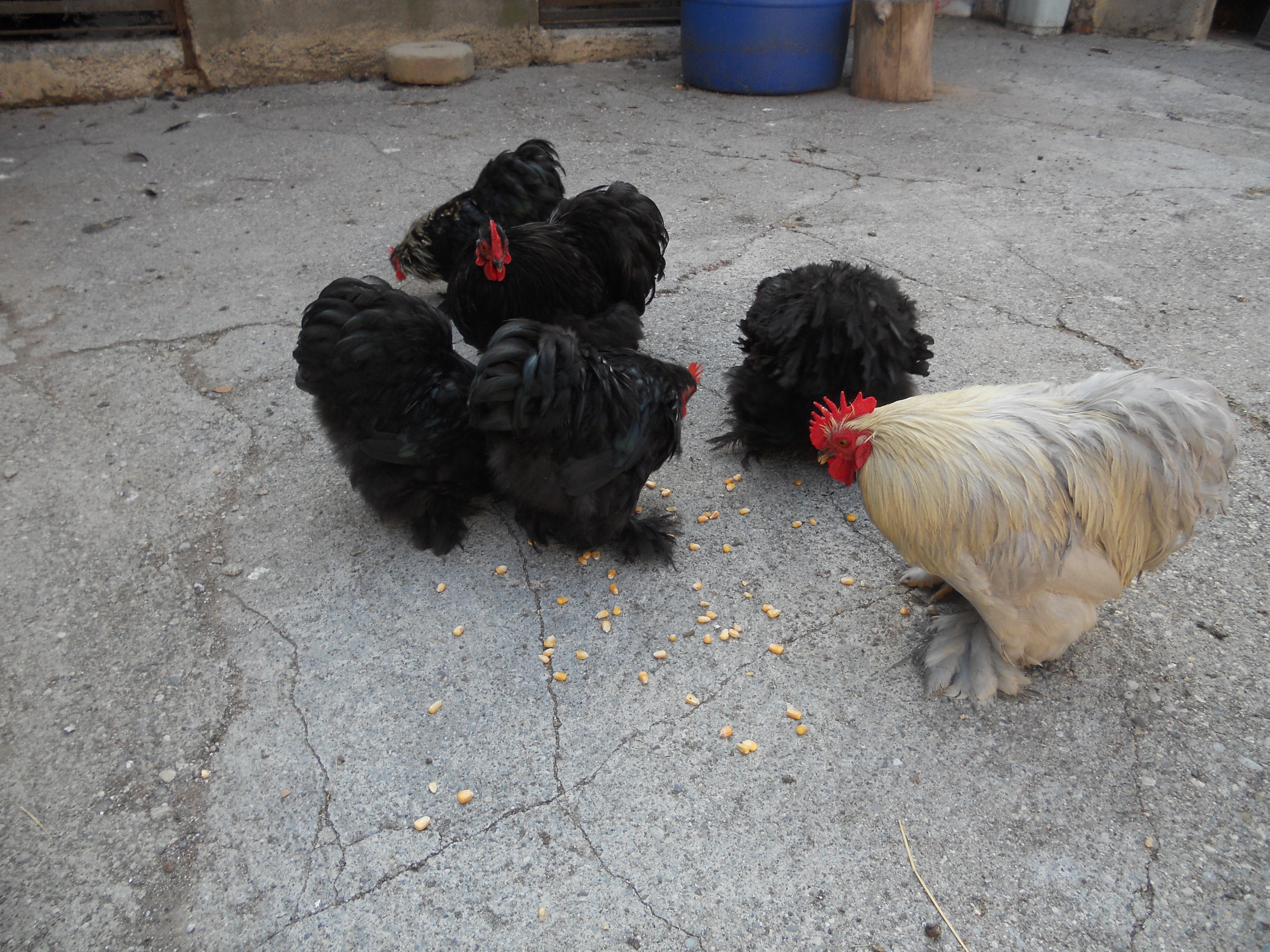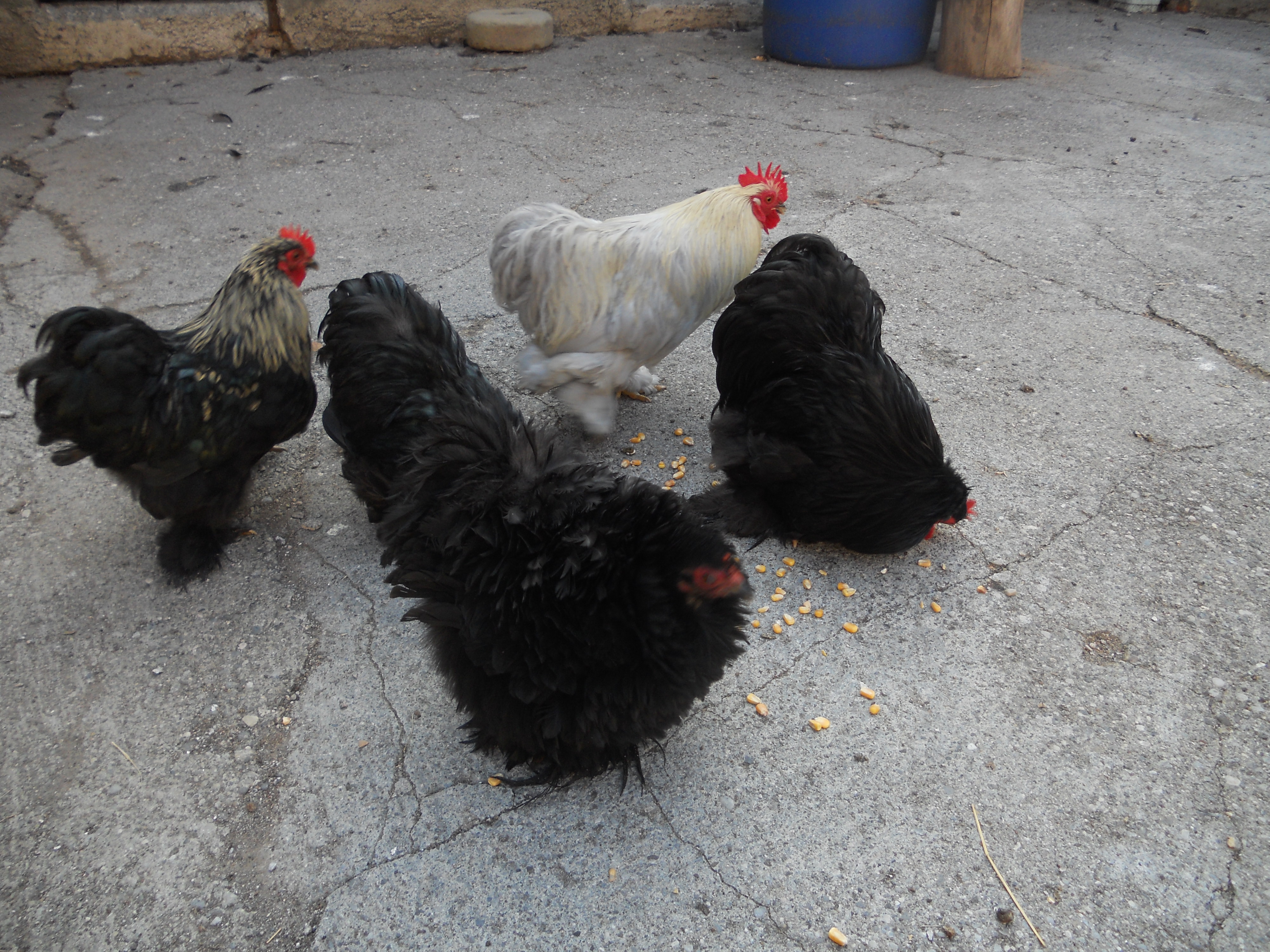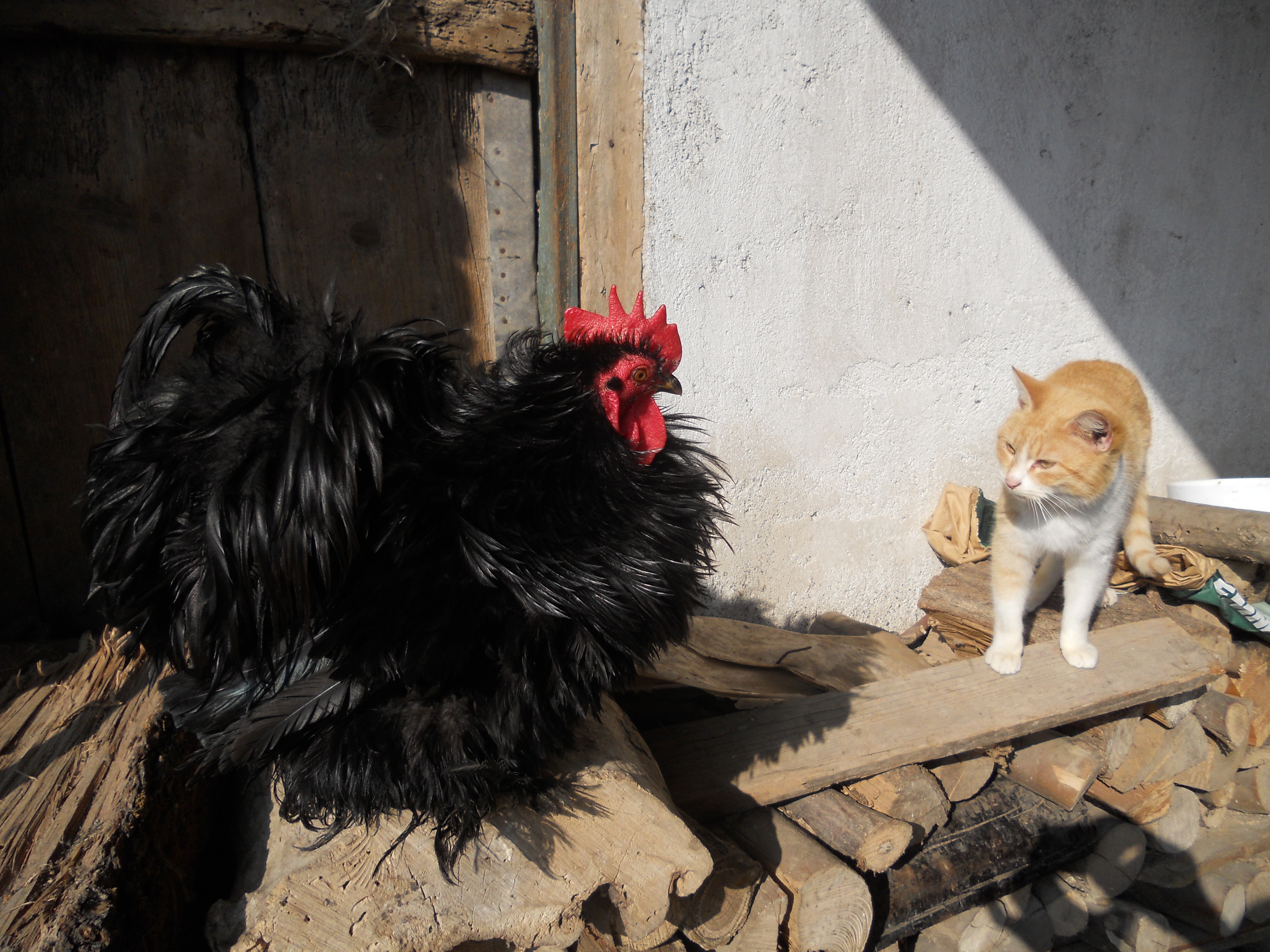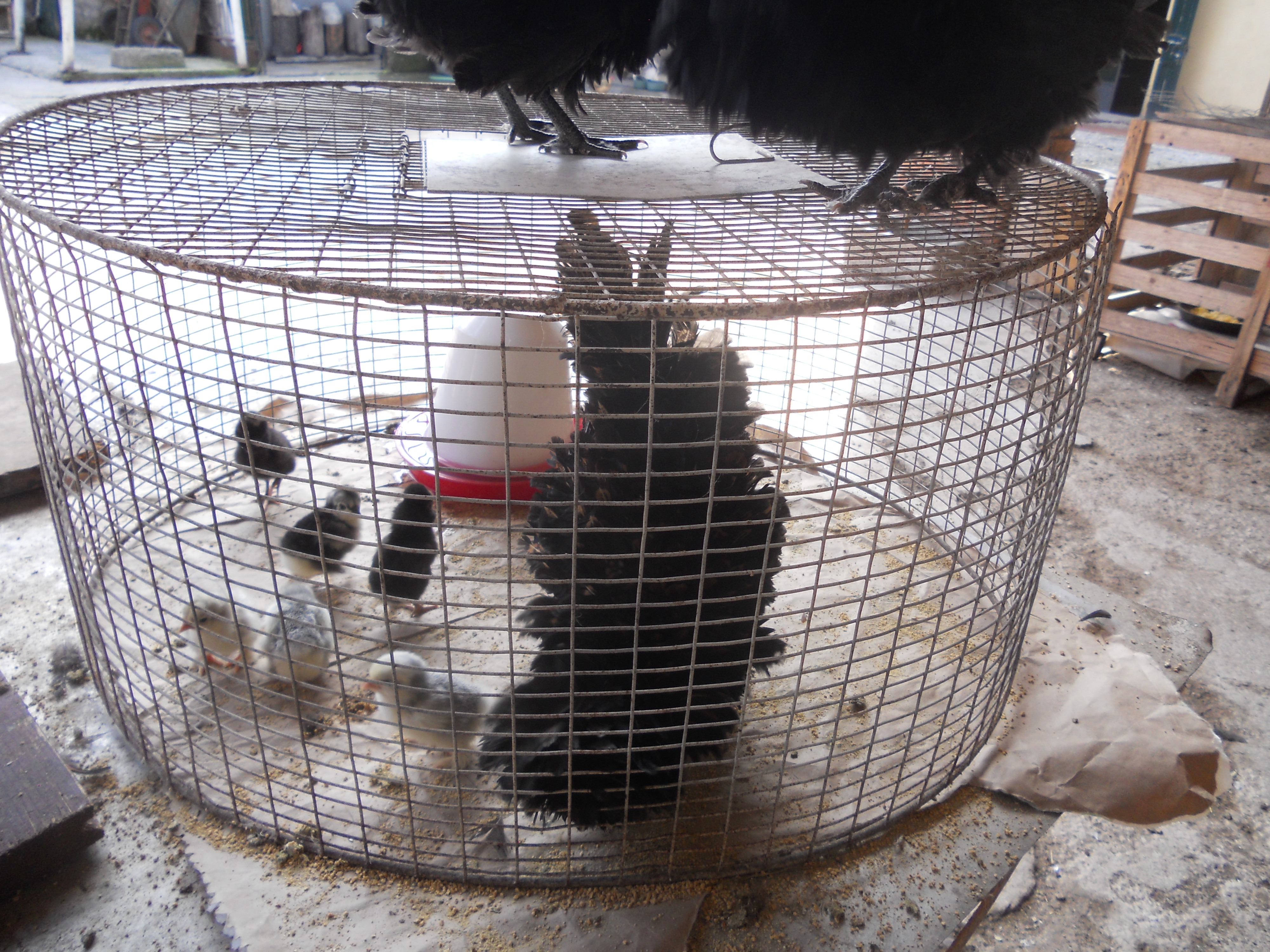 Ho comprato a una mostra avicola questa coppia di cocincini neri arricciati,sono molto simpatici e aggraziati anche se si sporcano facilmente a causa del ricchissimo piumaggio.A destra un gallo pollish riccio.